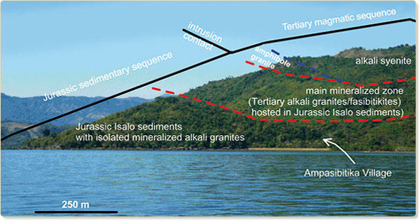 The main part of the 300 km² sized concession area is underlain by two contiguous Tertiary alkaline ring complexes which intruded into Jurassic sediments. The main REE mineralization concentrates along the contact between sediments and intrusives. It consists of late magmatic alkaline granites and associated REE skarns. The alkaline granites form multiple parallel vein systems which reach between 3 and 8 m in thickness. At least five of these vein systems occur within a 50 to 200 m wide zone. The majority of the veins dip with 15 to 45° towards the center of the intrusion. In the western part of the concession there are indications for bulk, non-vein hosted REE mineralization plus possibly REE bearing clays.