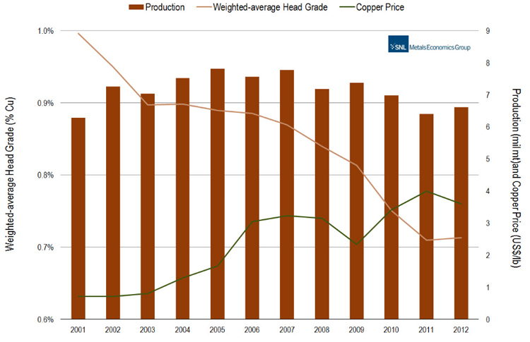 Cash operating costs at major mines also increased significantly, more than tripling over the past 10 years, to an average of almost $1.50/lb in 2012.