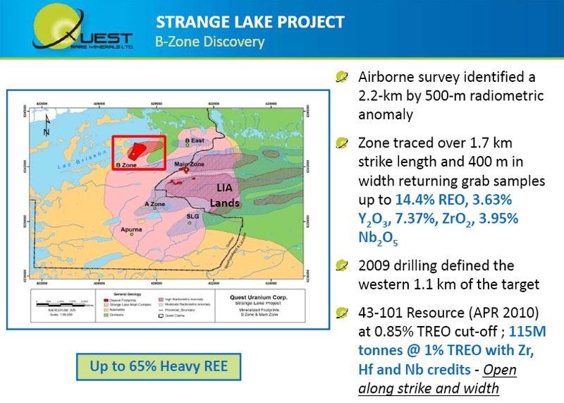 “In 2008, reconnaissance recognized there were some very, very strange and very high-grade values of Rare Earths within about a 10 km radius of the known deposits and so by 2009 we had done airborne geophysics over the area. We did some follow-up to that work and we discovered a significant deposit about 3 km away from the historical Iron Ore Company of Canada deposits and that’s led to the discovery of what we call the ‘B Zone’. And the B Zone is a very significant Rare Earths resource,” Peter tells us.
