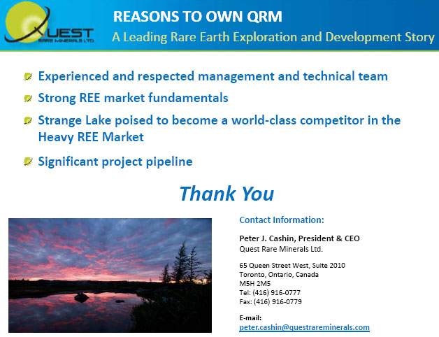 Peter sees the main strengths of Quest Rare Minerals as being the large size of the company, the low cost of the mining, and the high proportion of heavy Rare Earth element deposits which will deliver to an important and under-served portion of the Rare Earth consumption sector.