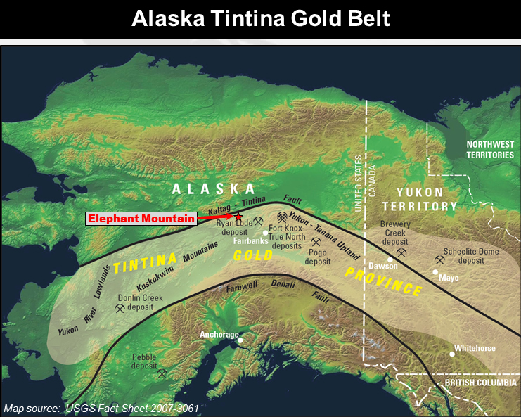 about 50 kilometers east of Elephant and Kinross’ Fort Knox gold mine in Fairbanks, all hosted in the same Cretaceous-aged