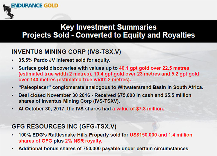 All three properties are subject to a 2% net smelter royalty which Endurance can purchase half at any time.