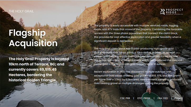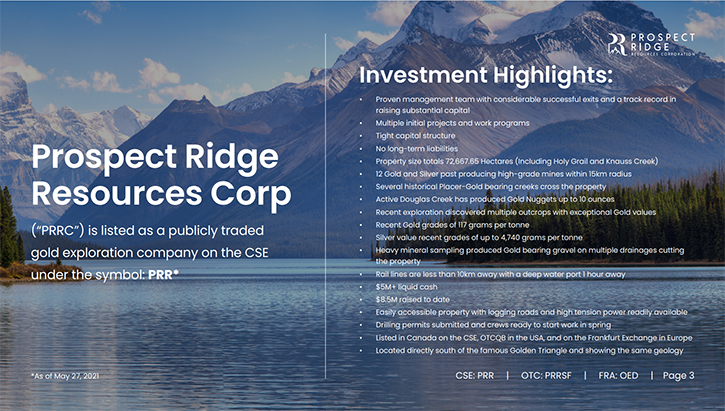We spoke with Nick Luksha, who is Executive VP of Prospect Ridge Resources Corporation (CSE: PRR, OTC: PRRSF, FRA: OED) a Canadian mining company with two properties in British Columbia: the flagship district-scale Knauss Creek and the Holy Grail property properties. The Holy Grail Property claim block has 12 past-producing high-grade gold and silver hard rock mines, within a 15km radius. In addition, several placer-gold bearing creeks that have been historically mined include the active operations of Douglas Creek, which has produced the coarsest placer gold, in the region, with gold nuggets up to 10 ounces. Recent exploration, in 2020 has discovered multiple outcrops, with exceptional gold values, showing gold grades in 10 to 70 grams per tonne, over a 3.5km by 6.5km area. Heavy mineral sampling produced gold bearing gravel on multiple drainages, cutting the property. The Knauss Creek property creates a contiguous block, with existing mineral claims, in the Holy Grail. Near-term plans include exploration programs on both properties this summer.