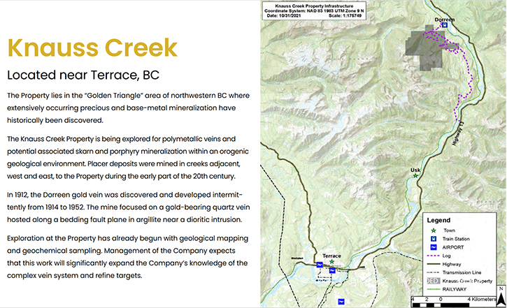 We are a gold exploration company, located just north of Terrace British Columbia, in Canada. We are focusing on the exploration of high-grade gold and silver. Our Team is headed by the legendary Michael Iverson, former Chairman, CEO and President of Fortuna Silver Mines. Mike also has started a couple of other very successful mining companies, including NioGold and Volcanic Gold Corp. Mike was in retirement, when these projects, that we are working on now, came along to him at Knauss Creek and the Holy Grail.